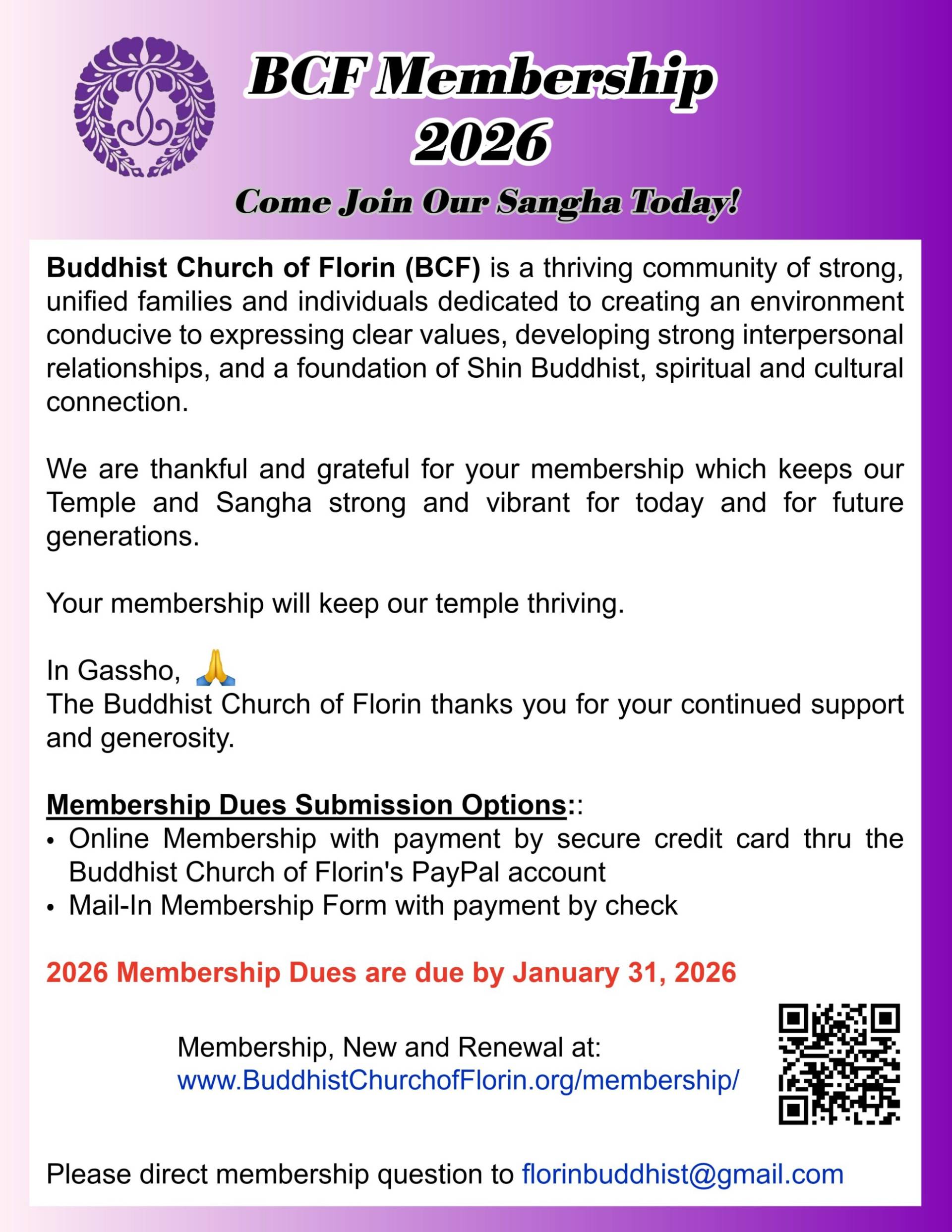 Mailing Address: Buddhist Church of Florin, P.O. Box 292006, Sacramento, CA 95829